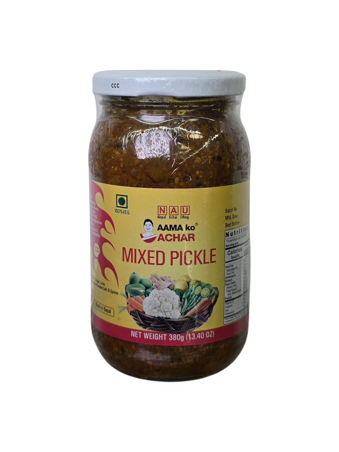 Aama Ko Achar – Mixed Pickle (380g) Bring home the authentic taste of Nepal with Aama Ko Achar Mixed Pickle. Made with a flavorful blend of fresh vegetables like cauliflower, carrots, green chilies, lemon, and traditional Nepali spices, this achar delivers the perfect balance of tangy, spicy, and savory goodness. Prepared using age-old homemade recipes, it is 100% vegetarian, hygienically packed, and ready to serve with rice, roti, snacks, or any meal. Experience real Nepali flavor in every spoonful!