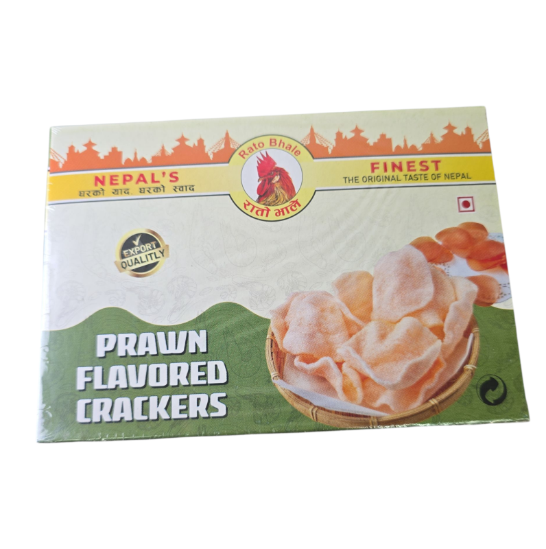 “Rato Bhale Prawn Flavored Crackers deliver the authentic taste of Nepal with their light, crispy texture and rich prawn aroma. Perfect for snacking or serving as a side dish, these export-quality crackers puff up beautifully when fried, offering a delicious crunch in every bite.”