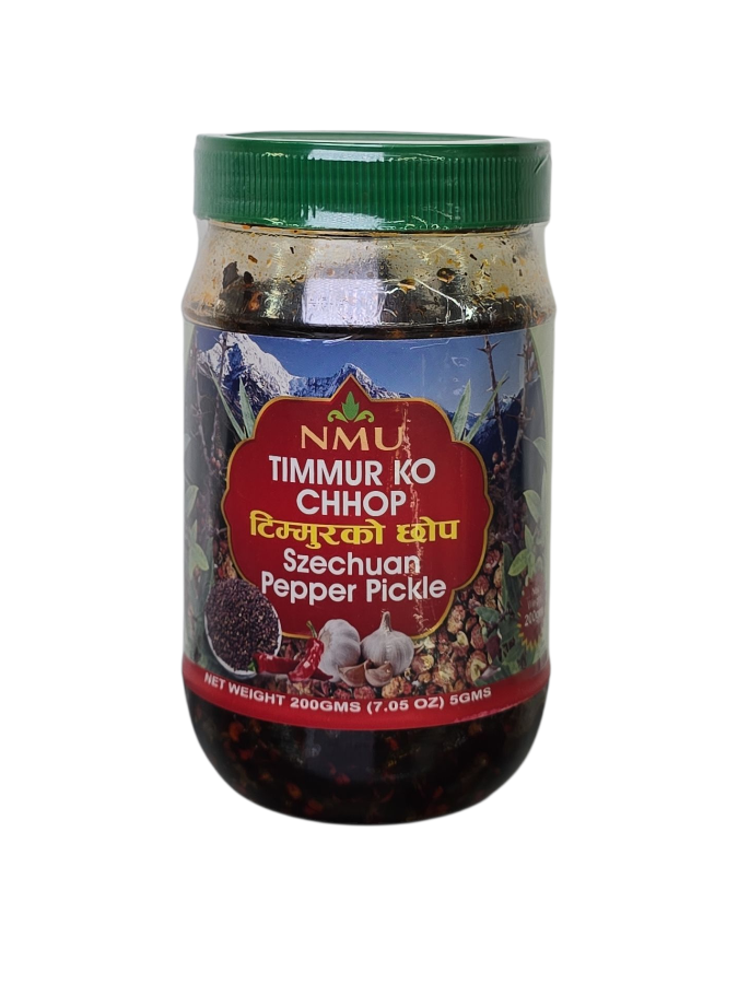 “NMU Timmur Ko Chhop is a bold and aromatic Szechuan Pepper Pickle made from authentic Nepali timmur. Bursting with spicy, tangy, and mouth-tingling flavors, it pairs perfectly with meals and snacks. A delicious traditional pickle that adds an unforgettable kick to every bite.”