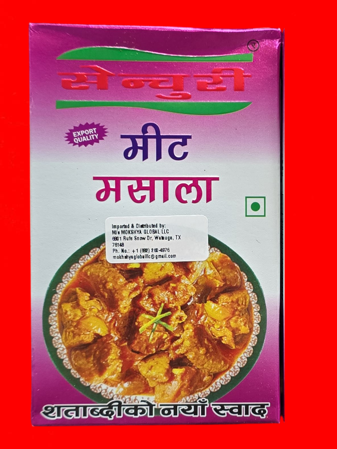 Meat Masala, a spice blend used to enhance the flavor of meat dishes. The packaging features vibrant colors and an image of a prepared meat curry, indicating its intended use. It is labeled as export quality and includes distributor information, suggesting it is sold internationally.